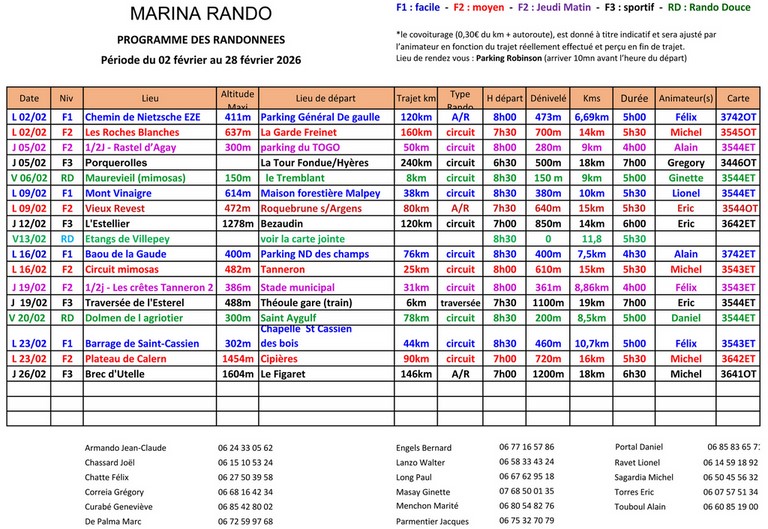 Un ENCART vous indiquera les jours et les horaires ainsi que les randos sélectionnées dans notre calendrier trimestriel.